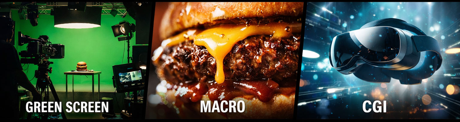 For the production of an augmented reality advertising spot, the techniques used are: green screen studio, rotoscoping, tracking camera, CGI and photorealistic modeling.